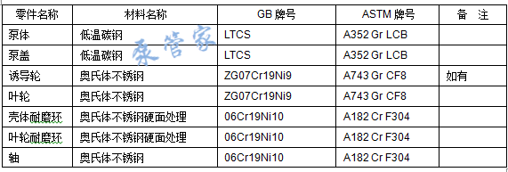 (3) 液化气泵:介质温度-45 ~ -20℃,推荐材料等级S-6(低温碳钢),主要零件材料清单见表6。