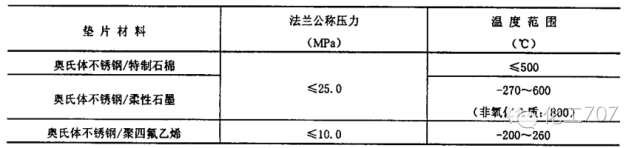 b)剧毒,可燃介质或温度高、温差大、地脚螺栓重量受机械振动或压力脉动的管道宜采用缠绕式垫片,并符合表1的使用条件: