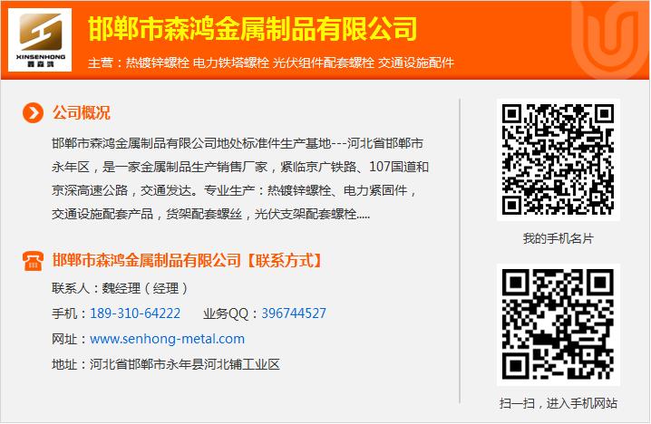 欢迎来到邯郸市森鸿金属制品有限公司网站,8.8级双头螺栓,我公司位于地处晋冀鲁豫四省区域中心和环渤海经济区腹心,不锈钢螺丝厂家孕育了新石器早期的磁山文化的邯郸市。不锈钢螺丝厂家不锈钢双头螺柱 具体地址是河北省邯郸市永年县河北铺工业区,联系人是魏经理。主要经营热镀锌螺栓,电力铁塔螺栓,光伏组件配套螺栓,交通设施配件。双头螺栓服务u型螺栓规格单位注册资金未知。双头螺栓规格尺寸表