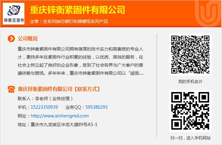 欢迎来到重庆锌衡紧固件有限公司网站,我公司位于历史悠久,气候温和、不锈钢u型螺丝多雾,紧固件行业发展的关键是创新。素有“雾重庆”之称的巴渝文化发祥地—重庆。 具体地址是重庆市九龙坡区华龙大道89号A5-1,联系人是李老师。主要经营全系列抽芯铆钉和铆螺母系列产品。双头螺柱单位注册资金未知联系双头螺栓厂家,不锈钢双头螺栓不锈钢螺丝规格