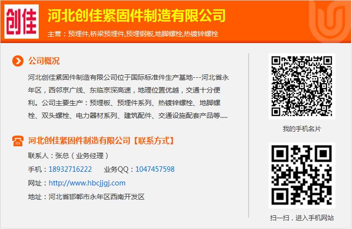 河北创佳紧固件制造有限公司主要生产:预埋板国标六角螺丝预埋件系列、热镀锌螺栓、不锈钢双头螺柱厂家地脚螺栓、螺栓螺母,双头螺栓、电力器材系列、不锈钢u型丝规格建筑配件外六角螺栓,交通设施配套产品等不锈钢u型螺丝规格地脚螺丝不锈钢u型卡厂家不锈钢螺丝规格尺寸我厂全体员工竭诚欢迎新老客户来电垂询,双头螺栓参观考察、洽谈合作!