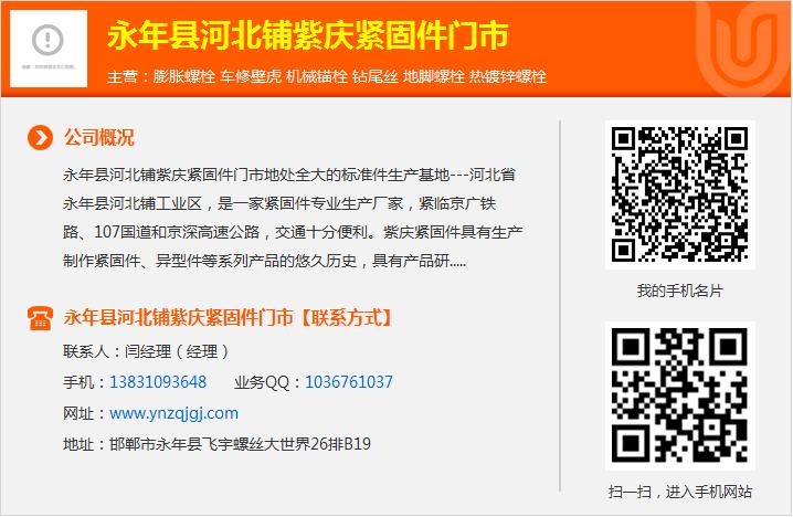 欢迎来到永年县河北铺紫庆紧固件门市网站等长双头螺柱外六角螺丝尺寸规格表.com/ target=_blank>不锈钢双头螺柱我公司位于地处晋冀鲁豫四省区域中心和环渤海经济区腹心,六角螺栓规格表f=http://www.gulunte.com/ target=_blank>u型螺栓规格尺寸不锈钢螺栓规格表孕育了新石器早期的磁山文化的邯郸市。不锈钢外六角螺栓 具体地址是河北省邯郸市永年县河北铺工业区不锈钢双头螺柱标准联系人是闫兵涛。主要经营膨胀螺栓,车修壁虎,机械锚栓,钻尾丝,地脚螺栓,热镀锌螺栓。u型螺栓厂家,高强度双头螺栓怎么进行热处理,使用防盗螺丝需要注意些什不锈钢u型卡规格尺寸表单位注册资金未知。国标外六角螺栓规格国标六角螺栓规格