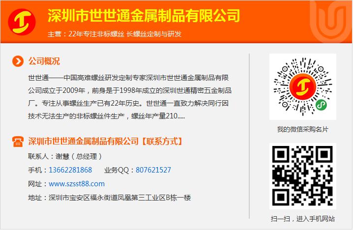 定制316不锈钢螺丝,316不锈钢螺丝,世世通20年老厂家由深圳市世世通金属制品有限公司提供。深圳市世世通金属制品有限公司()在紧固件这一领域倾注了无限的热忱和激情,世世通一直以客户为中心、不锈钢u型螺丝厂家为客户创造价值的理念、地脚螺丝以品质、服务来赢得市场,衷心希望能与社会各界合作,共创成功,外六角螺栓,共创辉煌。怎么安全使用高强度螺栓,国标六角螺栓相关业务欢迎垂询,国标六角螺栓规格联系人:谢慧。