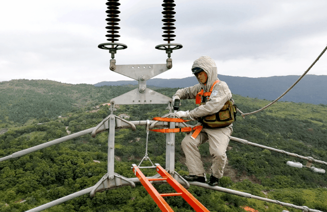 5月14日,使用防盗螺丝需要注意些什么,福建福州供电公司员工廖肇葵在连江县浦口镇上元村为220千伏中口线号塔带电紧固悬垂线夹U型螺栓。(陈蒸 陈德钧)