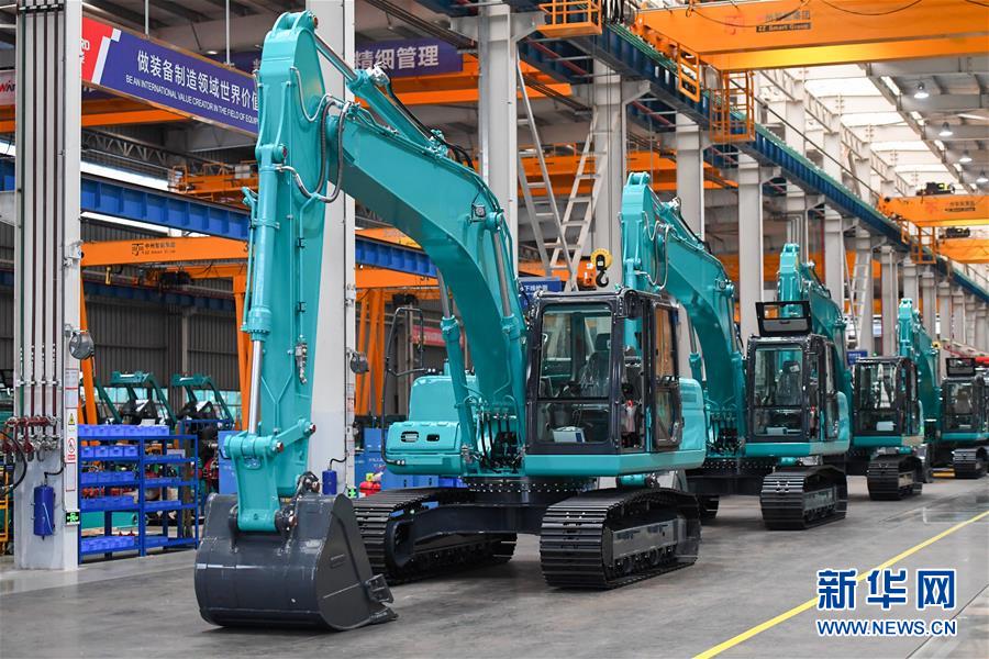 在位于湖南省长沙经开区的山河智能装备股份有限公司,工作人员在中型挖机装配车间生产线日摄)。新华社记者 陈泽国 摄